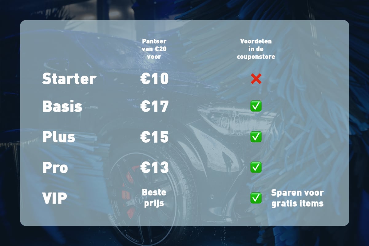 - VIP Member: je hebt de beste prijs voor je wasbeurt te pakken. Daarnaast spaar je punten die je vervolgens kunt verzilveren voor gratis schoonmaakartikelen. Exclusief voor abonnees.